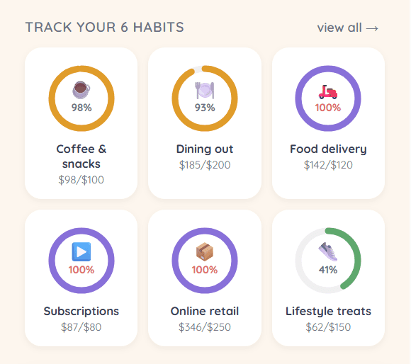 EasyPeasy tracks your 6 personal spending habits in real time. Each circle shows how close you are to your own limit — set by you, not us. No judgment. Just honest clarity.
