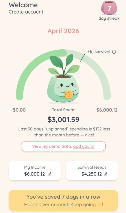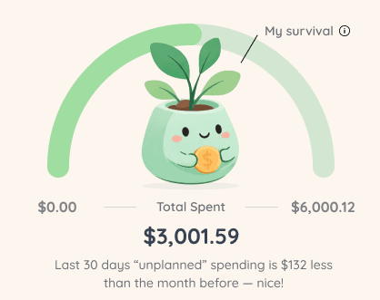 See your income, your actual spending, and what your Survival needs will cost — so you always know exactly where you stand, without opening a spreadsheet.